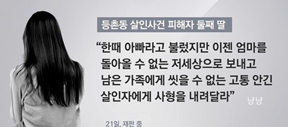 물론 일선에서 고생하는 많은 분들도 있지만 피해자를 보호할 수 있는 시스템과 범죄자를 격리할 수 있는 시스템이 있지 않는 한 이런 범죄는 또 일어나지 않을까 우려됩니다. 역대 가정폭력 사건 중에 손에 꼽힐 정도로 끔찍한 사건이 바로 등촌동 살인 사건입니다.