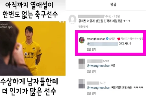 이강인 이나은 열애 소식이 터지자 아직 열애설이 없다는 이유만으로 한 누리꾼이 아직까지 열애설이 한 번도 없는 축구선수라며 수상하게 남자들한테 더 인기가 많은 선수라고 인스타에 게시물울 올렸습니다. 이에 황희찬 어디 사냐 댓글과 함께 직접 본인등판 소식을 전하기도 했습니다.