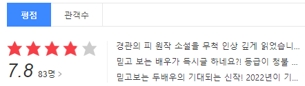 영화 경관의 피 평점은 위에 보는 것처럼 8점 전후 정도로 볼만한 정도가 아닌가 싶습니다. 최우식 조진웅 케미와 연기 위주로 보신 분들은 좀 더 재밌게 보신 듯하고 시나리오를 중시하는 분이라면 큰 반전 없이 영화의 결말이 이루어져 그 점이 아쉬울 것이라 봅니다.