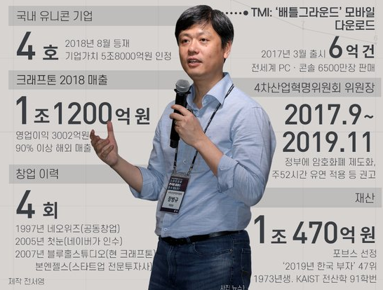 크래프톤 의장 장병규 나이 48세 1973년 4월 25일생이며 고향 대구 출생입니다. 학력 대구과학고 한국 과학기술원 대학원 박사과정 수료했으며 장병규 재산은 10억 달러 한화 약 1조 1300억 원입니다. 장병규 아내 와이프 정승혜 씨로 알려져 있습니다. 주요 경력으로는 네오위즈 이사, 첫눈 CEO, 블루홀스튜디오 대표 등을 맡은 적이 있습니다. 배틀 그라운드 게임 하나로 전 세계를 뒤흔든 히트작을 만들었죠.